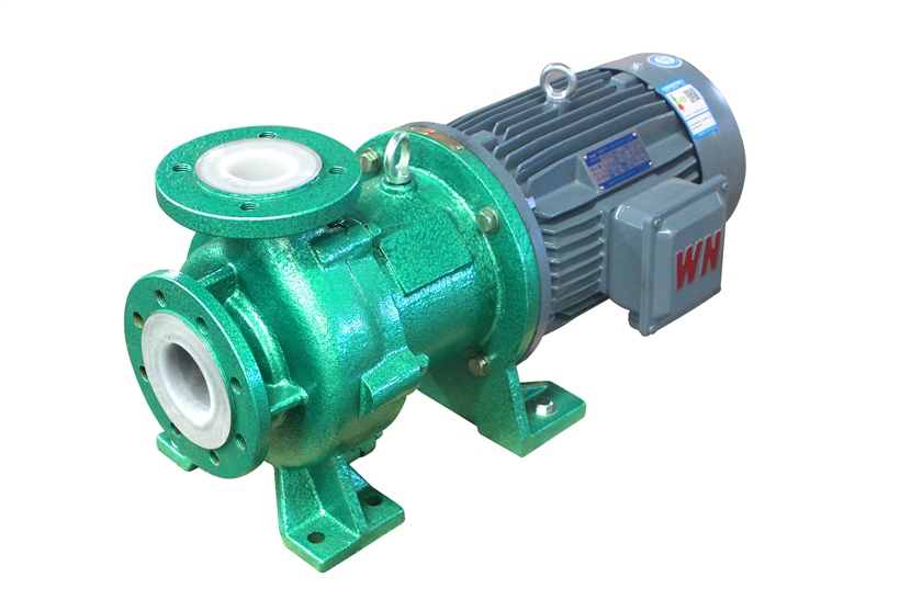 泵運轉時,氟塑料磁力泵必須用少量的液體對內磁轉子與隔離套之間的環(huán)隙區(qū)域和滑動軸承的摩擦副進行沖洗冷卻。當冷卻潤滑液不夠或沖洗孔不暢、堵塞時,將導致介質溫度高于永磁體的工作溫度,使內磁轉子逐步失去磁性,使磁力傳動器失效。冷卻液的流量通常為泵設計流量的2%-3%,內磁轉子與隔離套之間的環(huán)隙區(qū)域由于渦流而產生高熱量。當介質為水或水基液時,可使環(huán)隙區(qū)域的溫升維持在3-5℃;當介質為烴或油時,可使環(huán)隙區(qū)域的溫升維持在5-8℃。