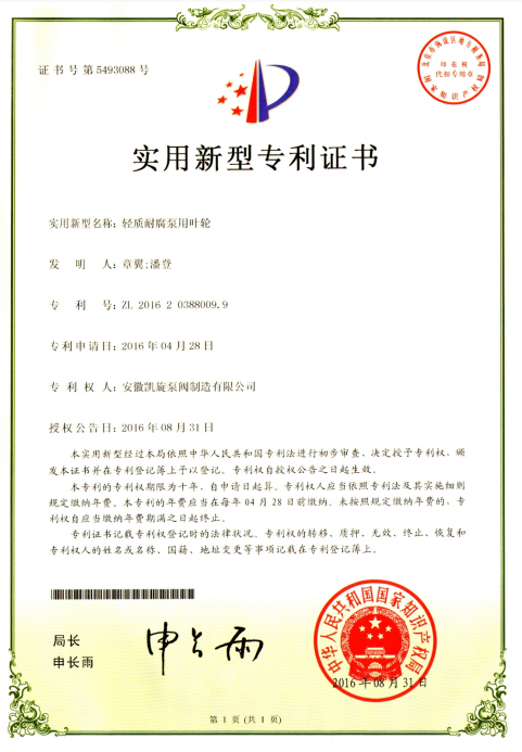 專利證書:輕質(zhì)耐腐泵用葉輪