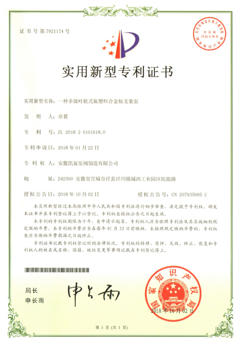 專(zhuān)利證書(shū):一種多級(jí)葉輪式氟塑料合金短支架泵