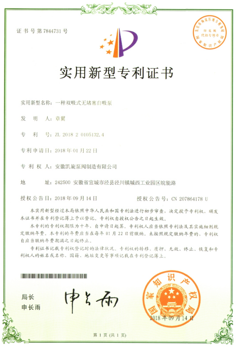 專利證書:一種雙吸式無堵塞自吸泵