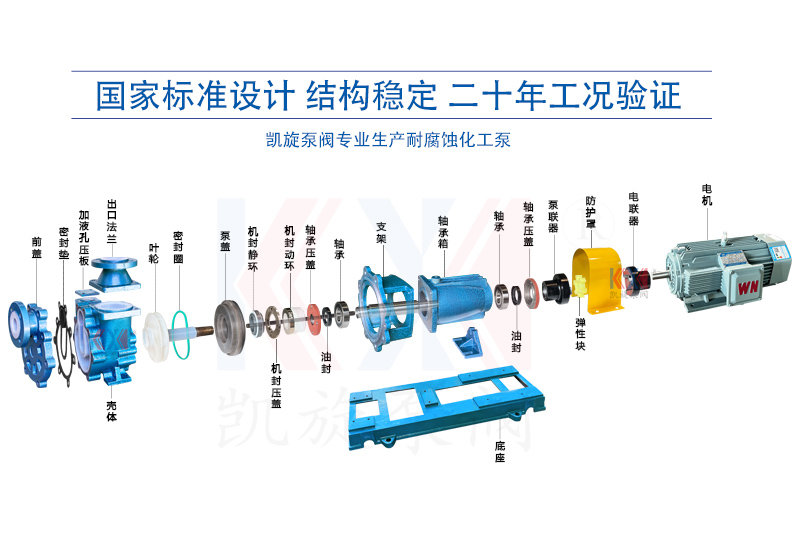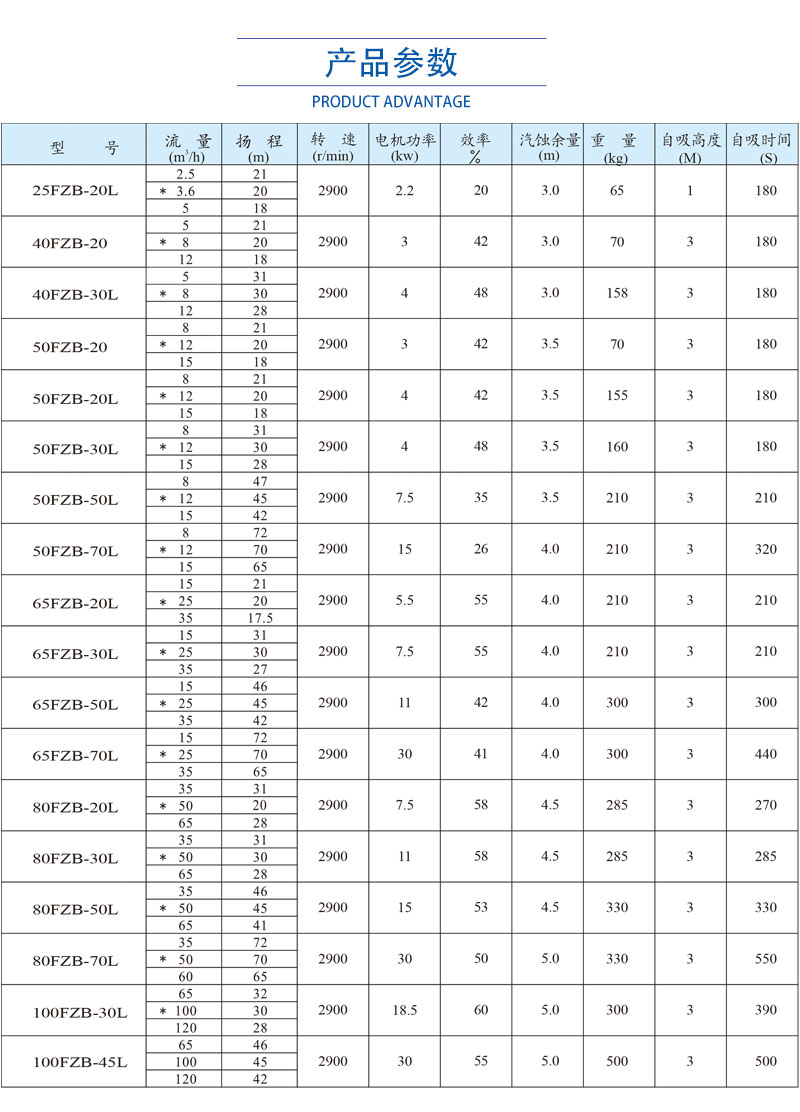 FZB型氟塑料自吸泵的主要部件有泵體、止回閥、前蓋、密封墊、泵蓋、葉輪、密封、軸承箱、電動機(jī)、底座。過流部件使用氟塑料合金制造。泵體部分由吸液室、儲液室、蝸殼、回流孔、氣液分離室等組成。當(dāng)泵啟動后,在離心力的作用下,泵體吸水室中的剩余液體與進(jìn)液管路中的空氣,被葉輪攪拌成氣水混合物;旌衔锝(jīng)蝸殼進(jìn)入氣液分離室,隨著流速的減慢,導(dǎo)致氣水分離,空氣由泵出口排出,液體經(jīng)回水孔返回泵內(nèi)。反復(fù)多次循環(huán),進(jìn)液管道中的空氣被排凈,使泵內(nèi)形成一定的真空度,達(dá)到自吸的作用。 FZB自吸泵是抽低液位腐蝕性介質(zhì)的理想用泵。尤其適用于抽吸低位槽工況,安裝時無需另配底閥,自吸高度范圍在1-5米內(nèi)。擁有更大的氣液分離室,通暢的回流通道,且進(jìn)口設(shè)計(jì)有先進(jìn)的止回閥,防止停泵后液體回流。泵高低壓區(qū)密封可靠,自吸時間明顯縮短,進(jìn)口抽空力強(qiáng),大幅提升自吸性能。泵體設(shè)計(jì)有灌液孔、放液孔,最大限度滿足了不同工況下的使用需求。